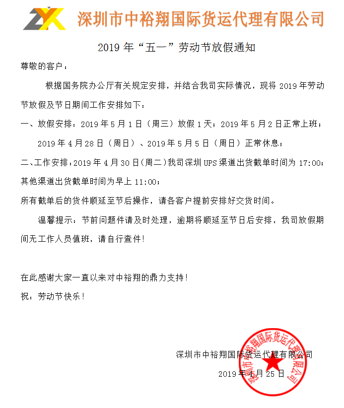 2019年“五一”劳动节放假通知